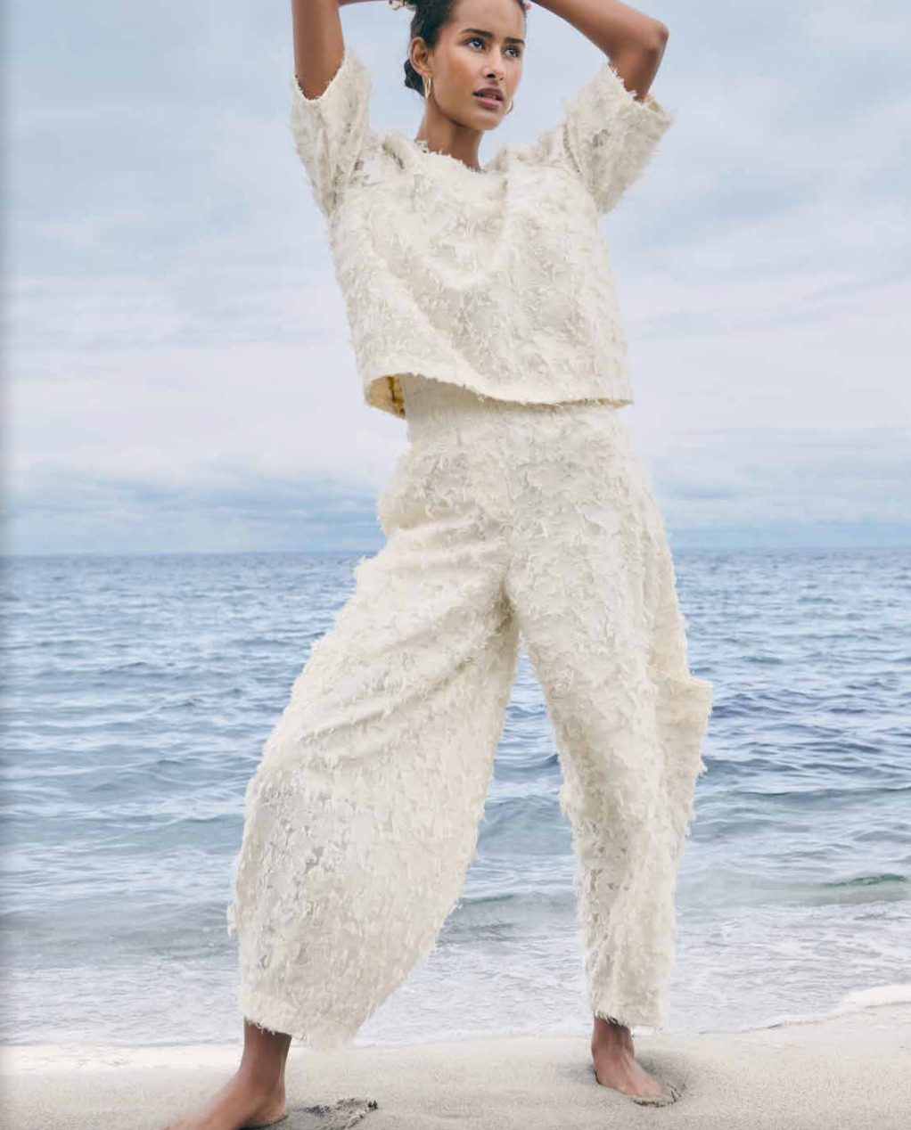 The collection revolves around flattering silhouettes and captivating prints and seamlessly blends statement pieces crafted from innovative materials and adorned with unique finishes.