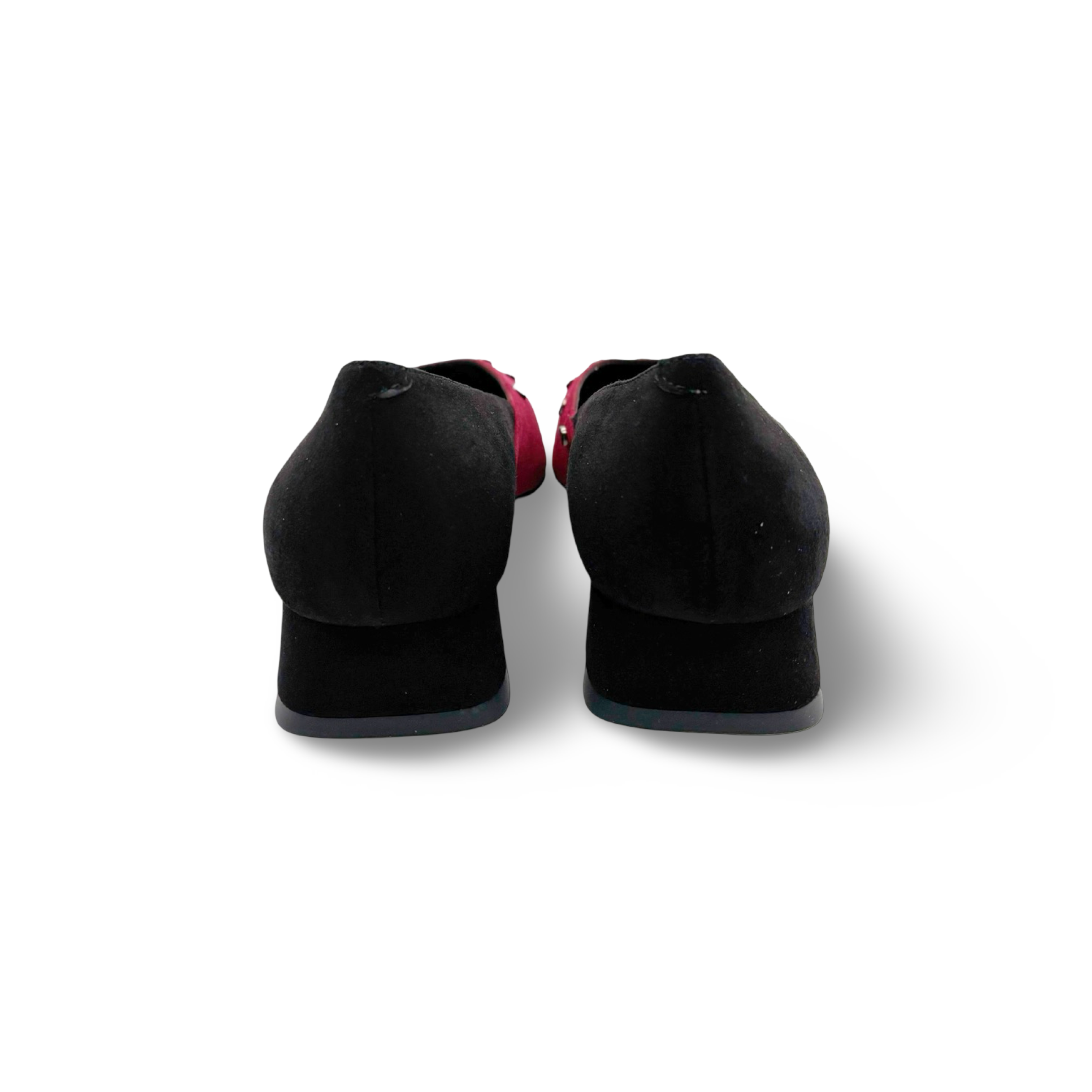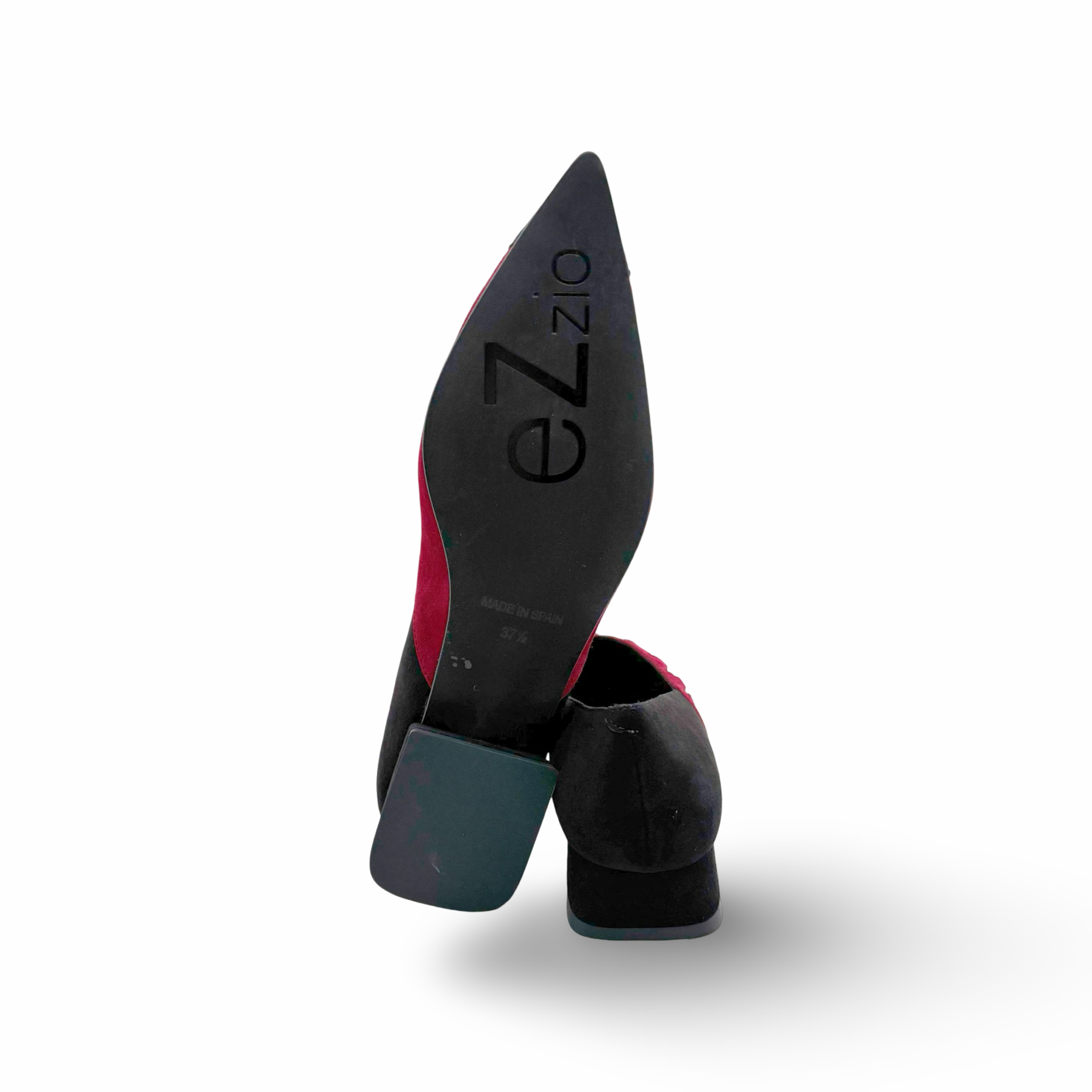 A young brand with a high commitment to fashion. eZzio is chosen by women, who give close attention to their outfits. This beautiful flat has a modern vibe and shape and comes in a beautiful soft black and burgundy suede. There is detailing across the top of the vamp and the shoe is very light in weight.