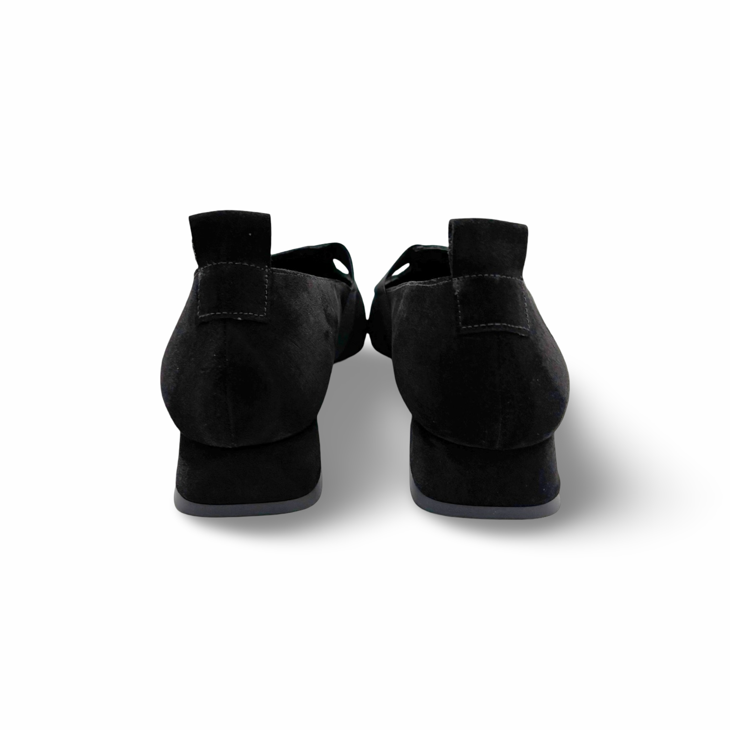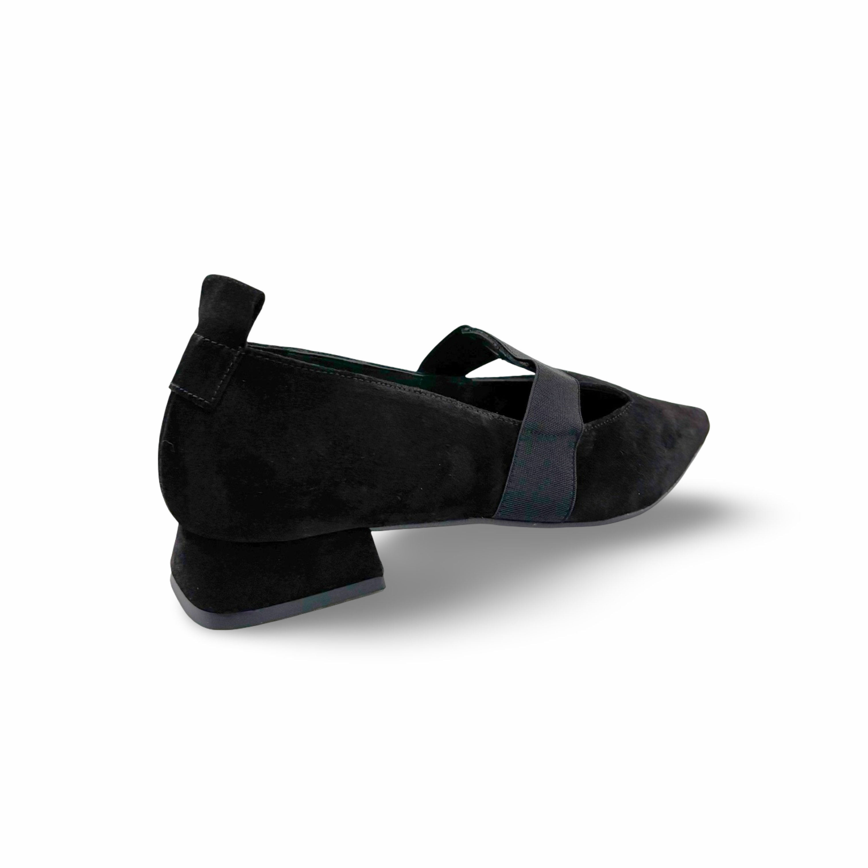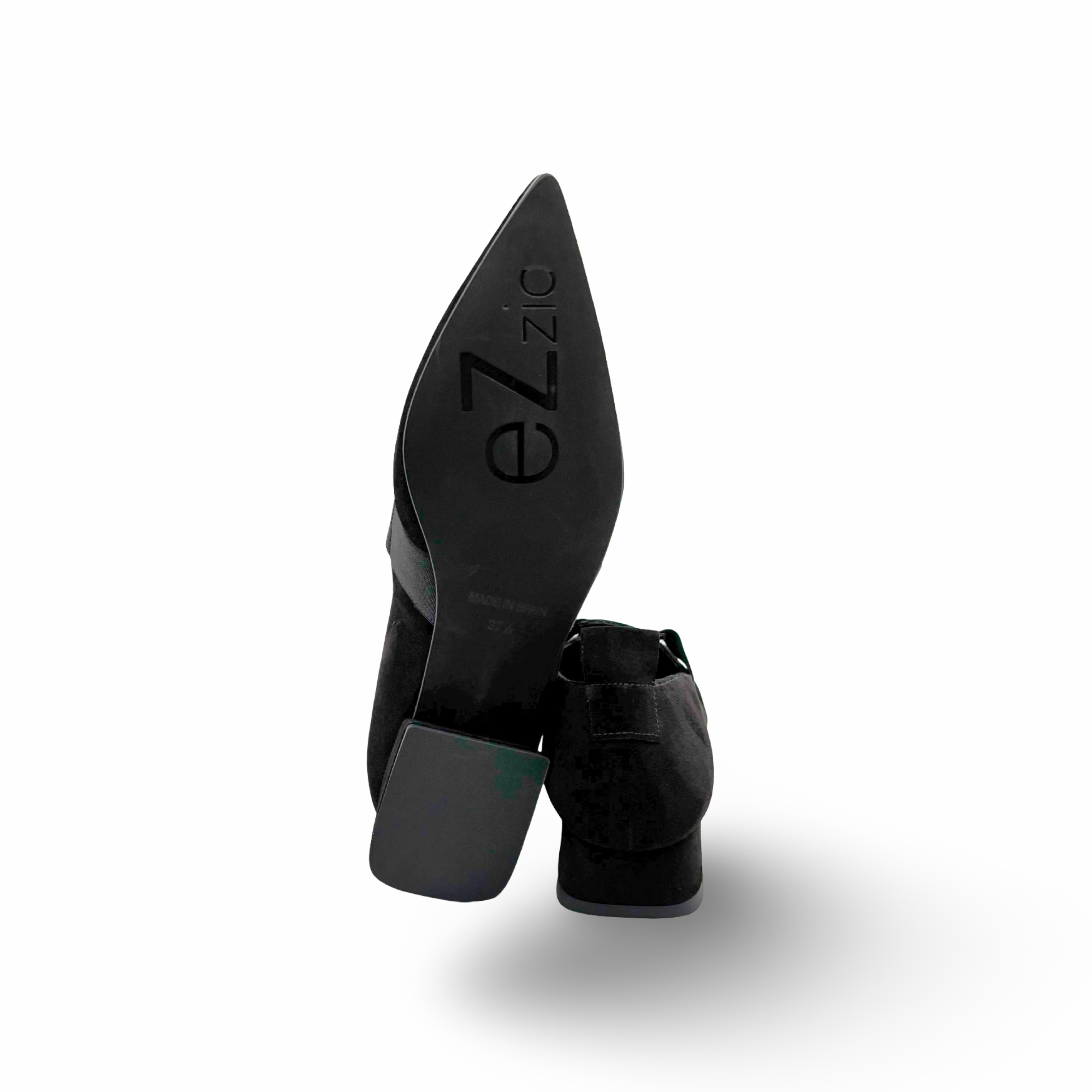 A young brand with a high commitment to fashion. eZzio is chosen by women, who give close attention to their outfits. This suede flat has a modern vibe and shape and comes in a beautiful soft black suede and low heel. There is detailing across the top of the vamp and the shoe is very light in weight.