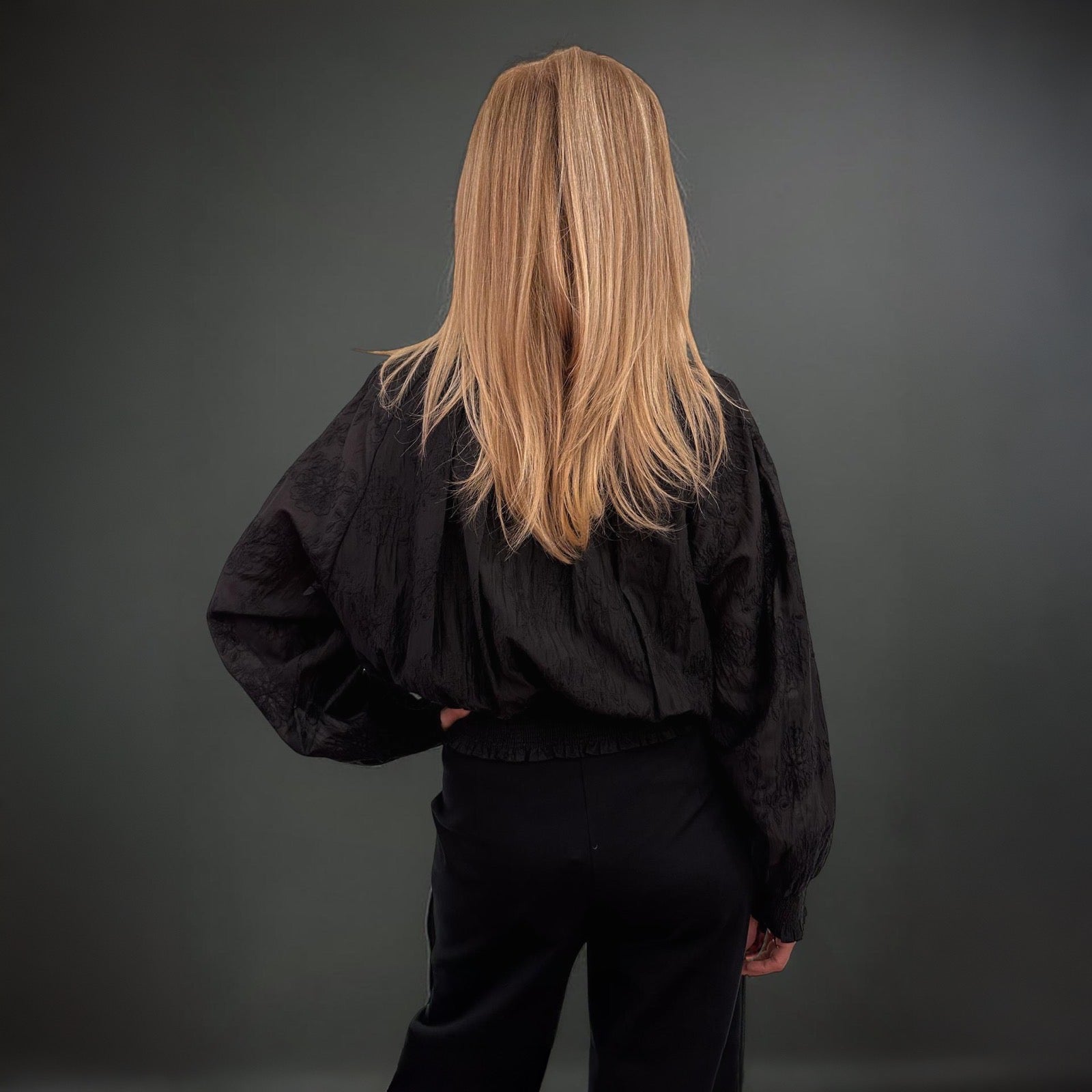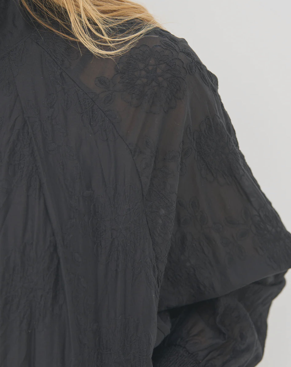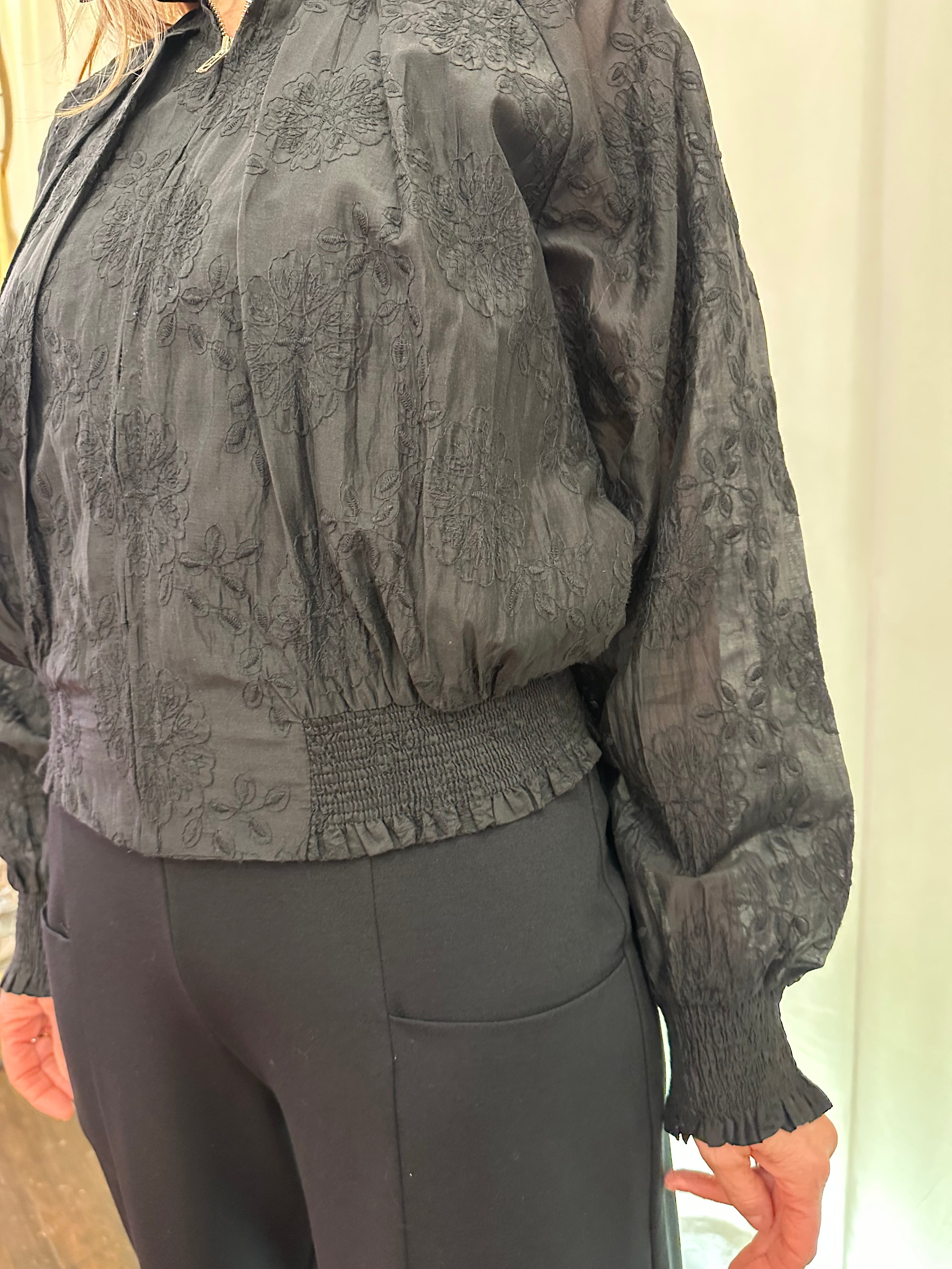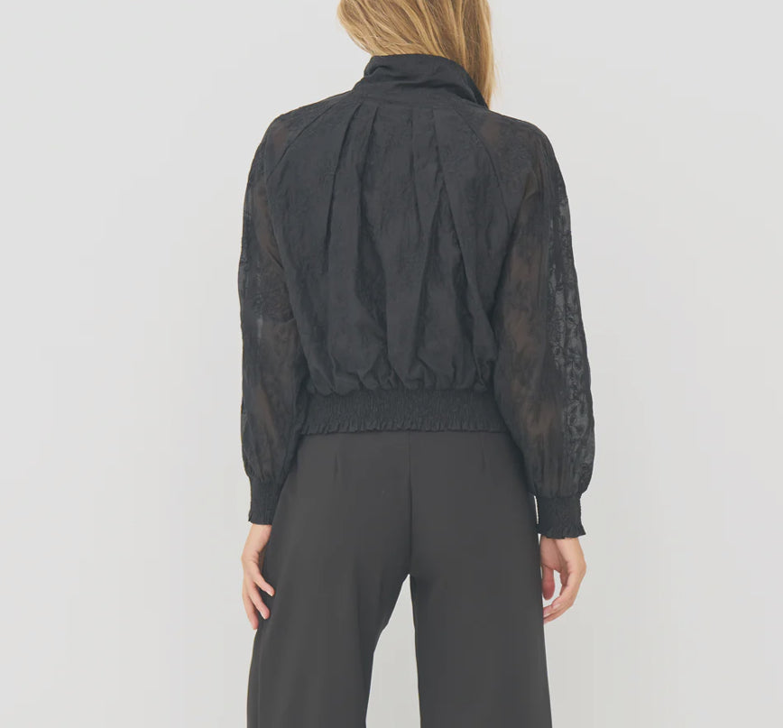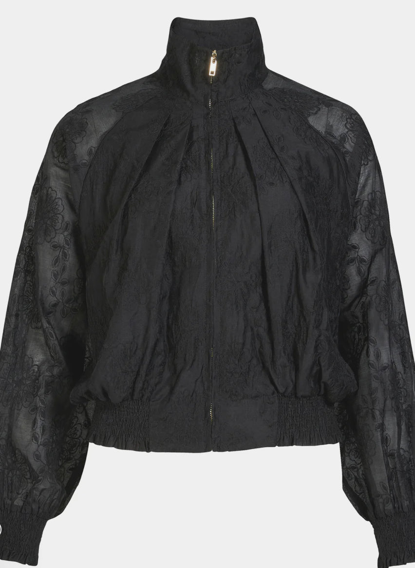 Add a feminine twist to your wardrobe with this lightweight jacket featuring embroidered flowers and beautiful transparent details. The jacket has a high collar, front zip closure, and gathers at the shoulders, creating a voluminous look. The wide elastic at the waist and cuffs gives the jacket a flattering shape and a comfortable fit.