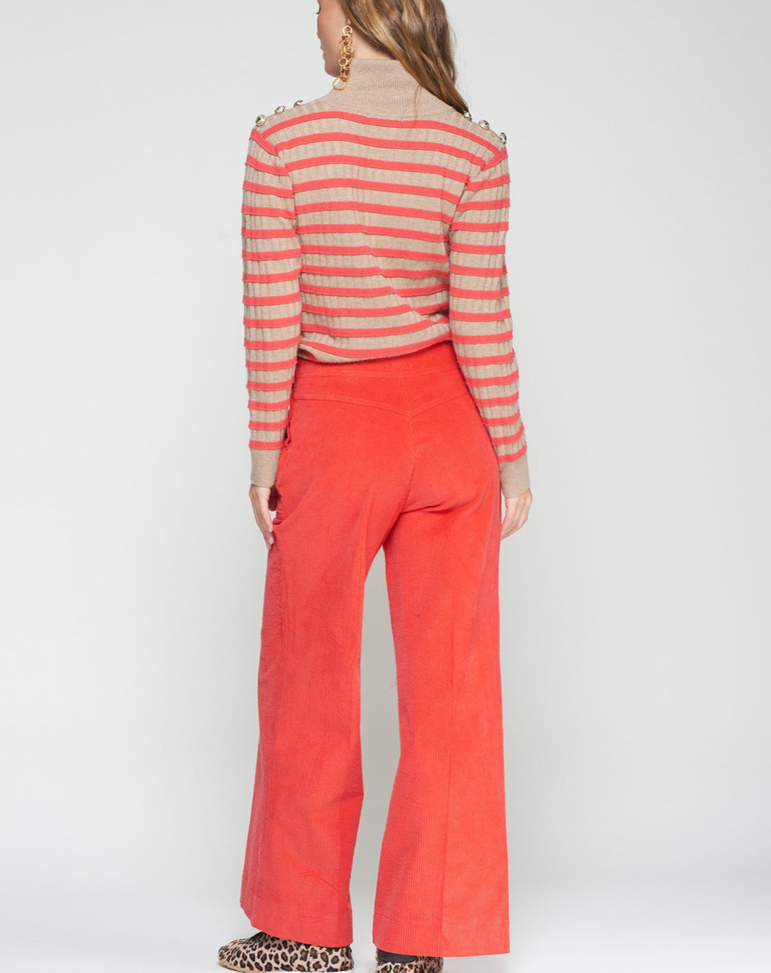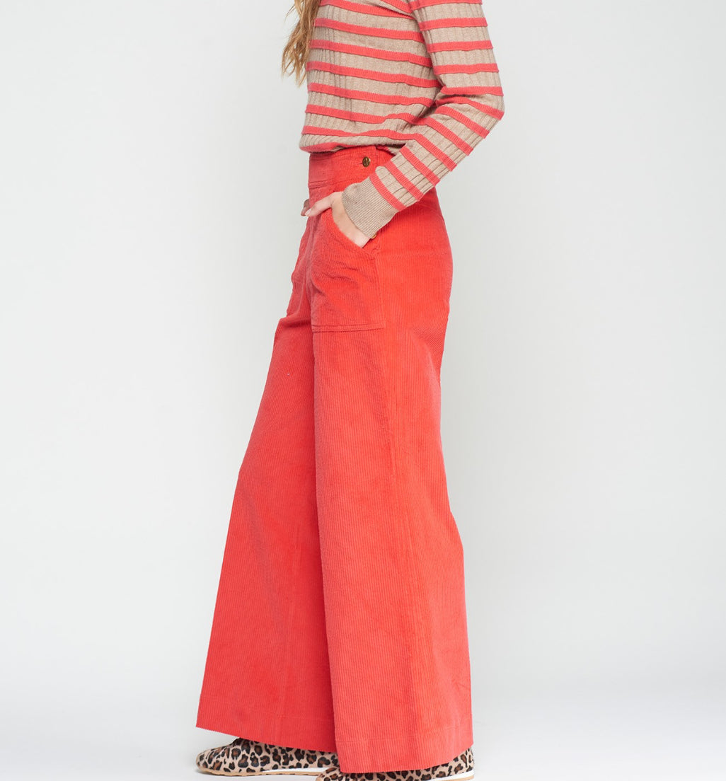 Orange corduroy trousers made from mid-weight textured fabric with visible ribbing. Straight-leg cut with wide leg opening. Features front patch pockets and side fastening with visible metallic buttons on both sides of the waist. Central seam and straight hem finish. Unlined structure.
