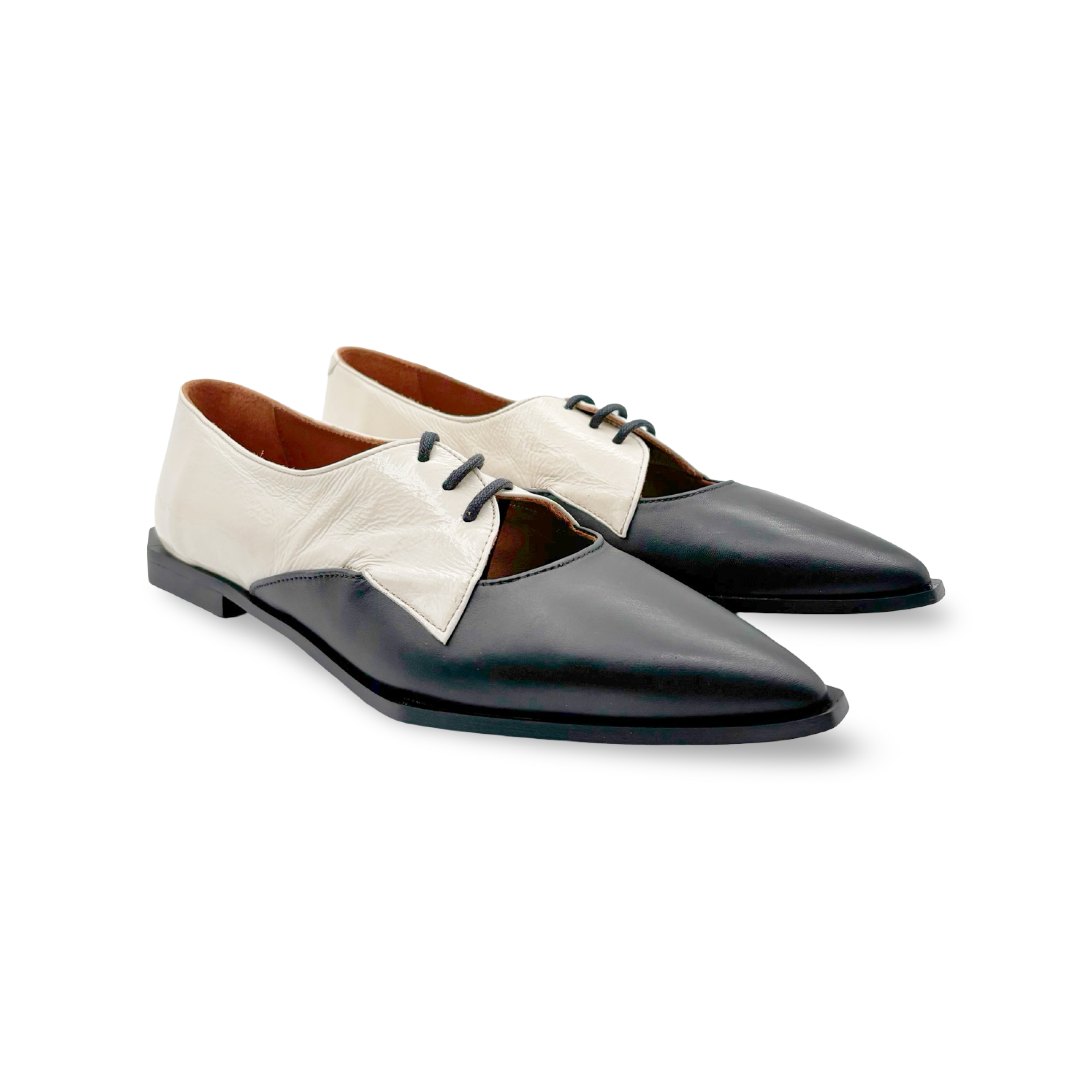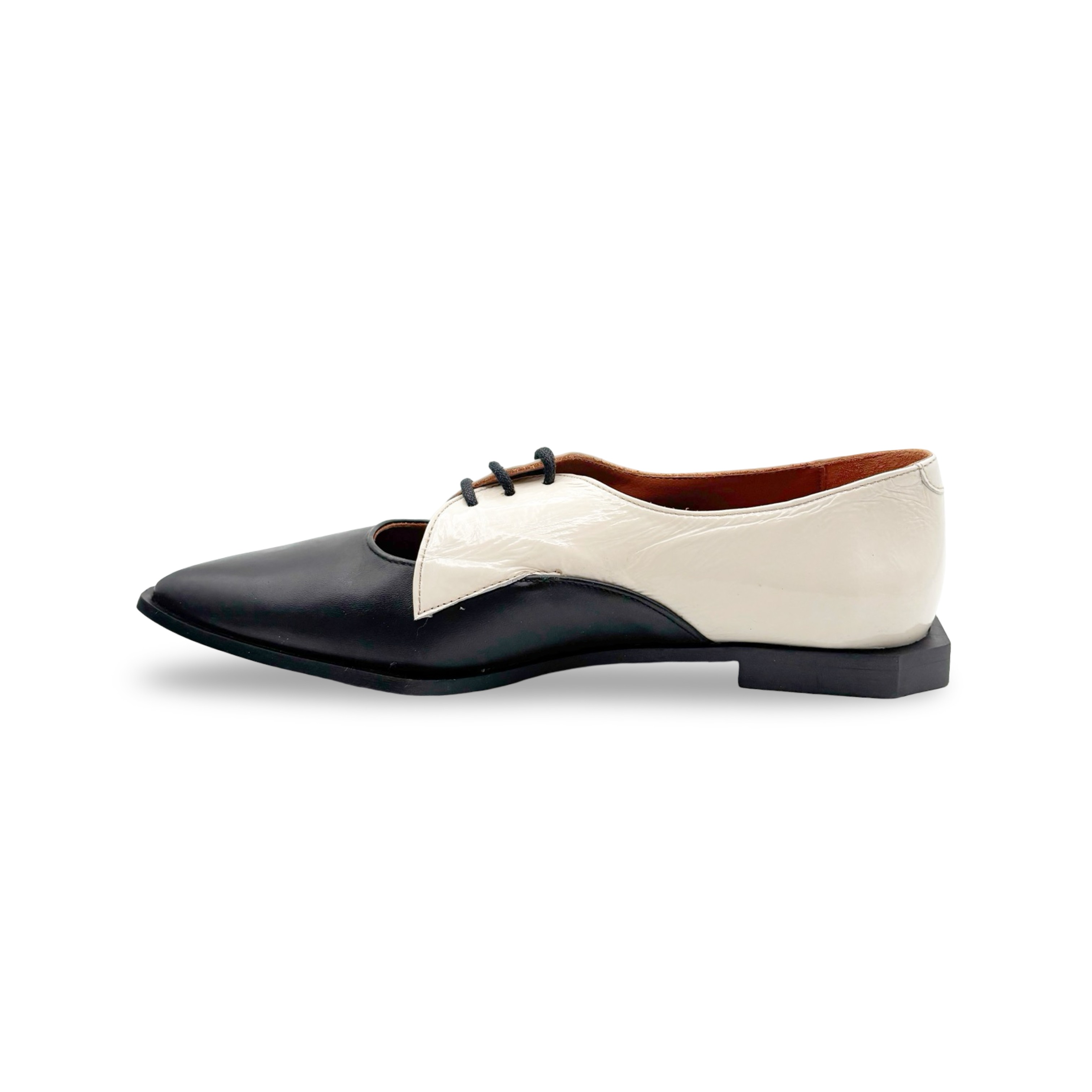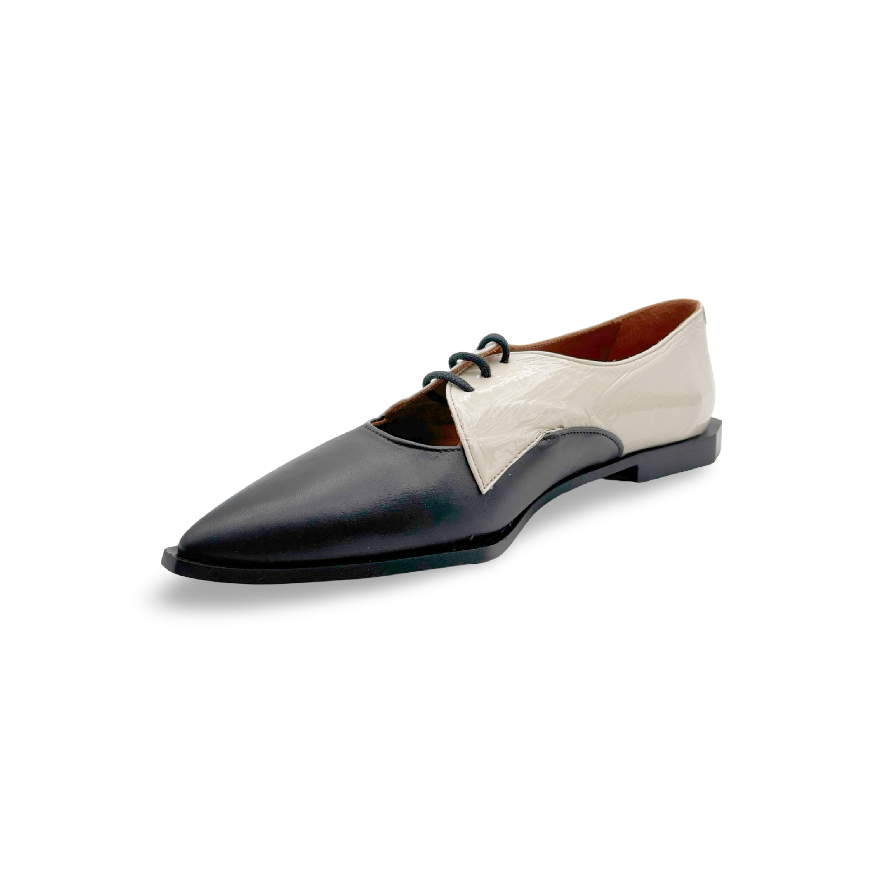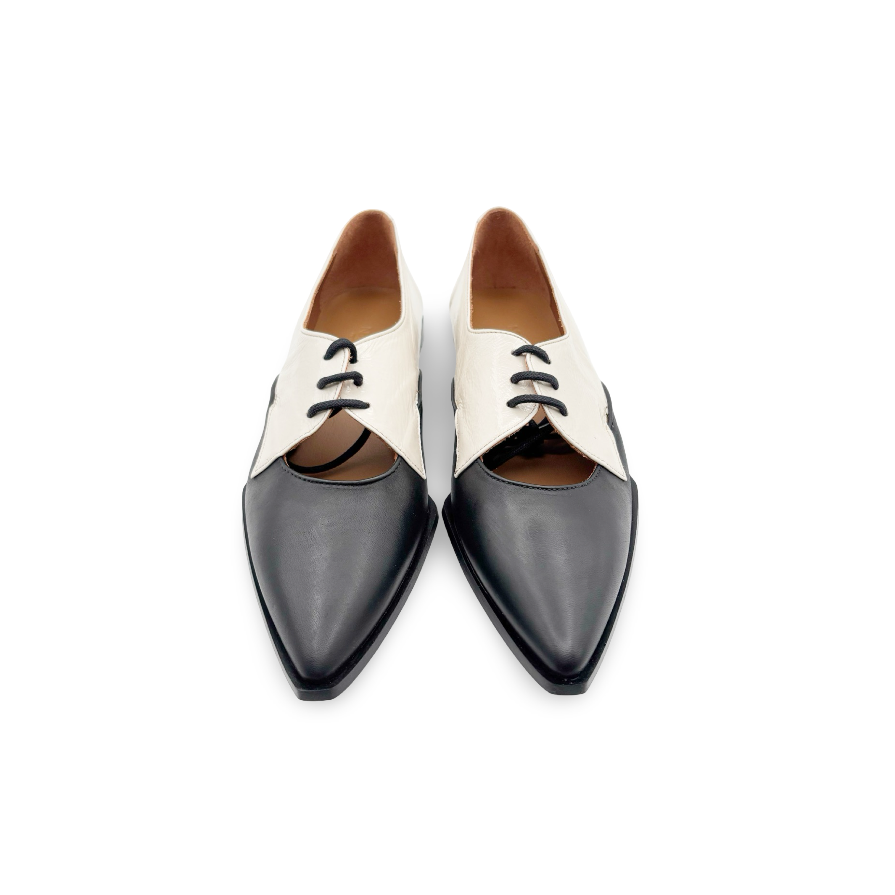 Step into pure sophistication with this striking black and white pointed-toe lace-up loafer, crafted in Spain for uncompromising quality. The killer fit hugs your foot just right, while the dramatic metallic accents add instant edge to any outfit. Pair with wide-leg trousers for effortless polish, or dress them down for a fun twist on everyday style. These aren't just shoes—they're a confidence boost you'll actually want to wear.
