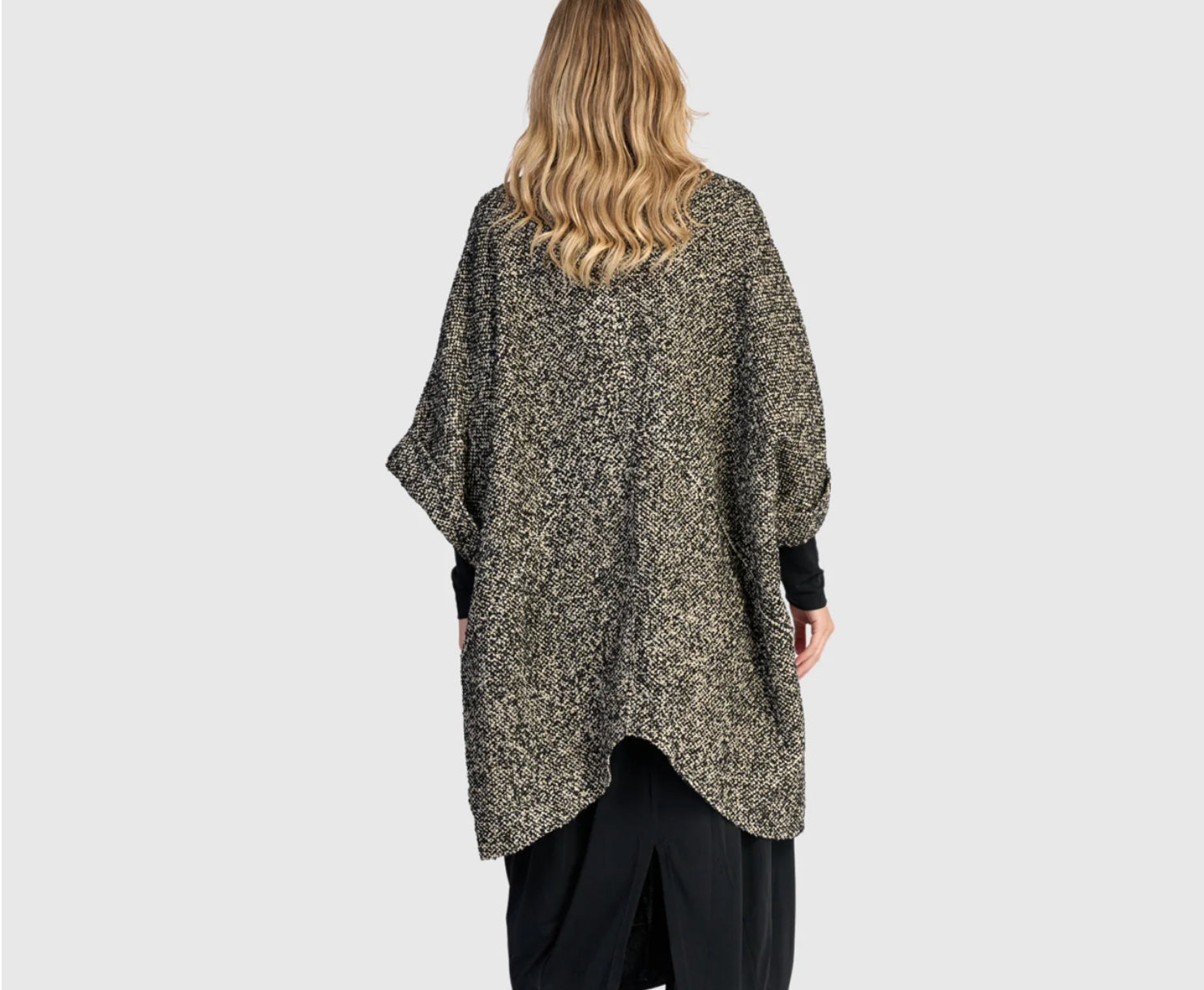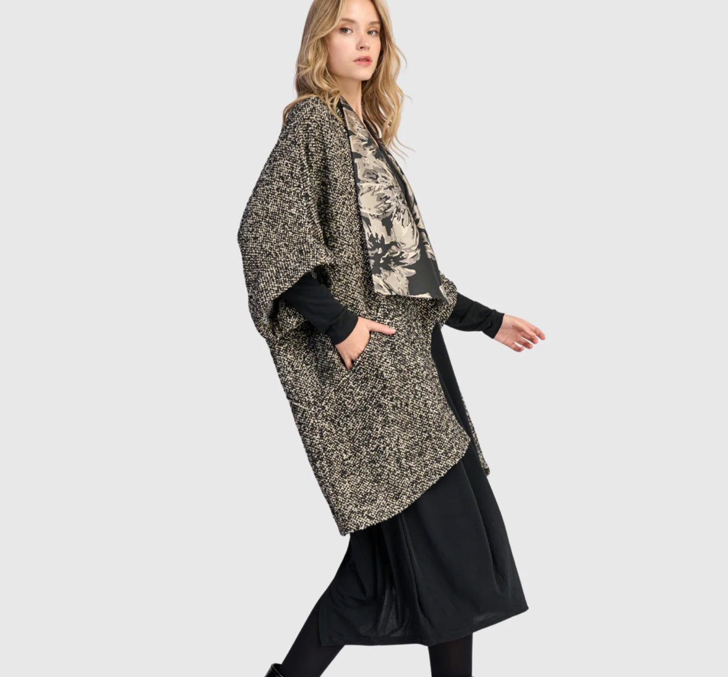 Soft boucle and metallic brocade combine in this sculptural coat with a rounded silhouette and elbow-length dolman sleeves. The draped lapels and curved hem create fluidity, while the oversized fit adds a confident, cocoon-like shape.