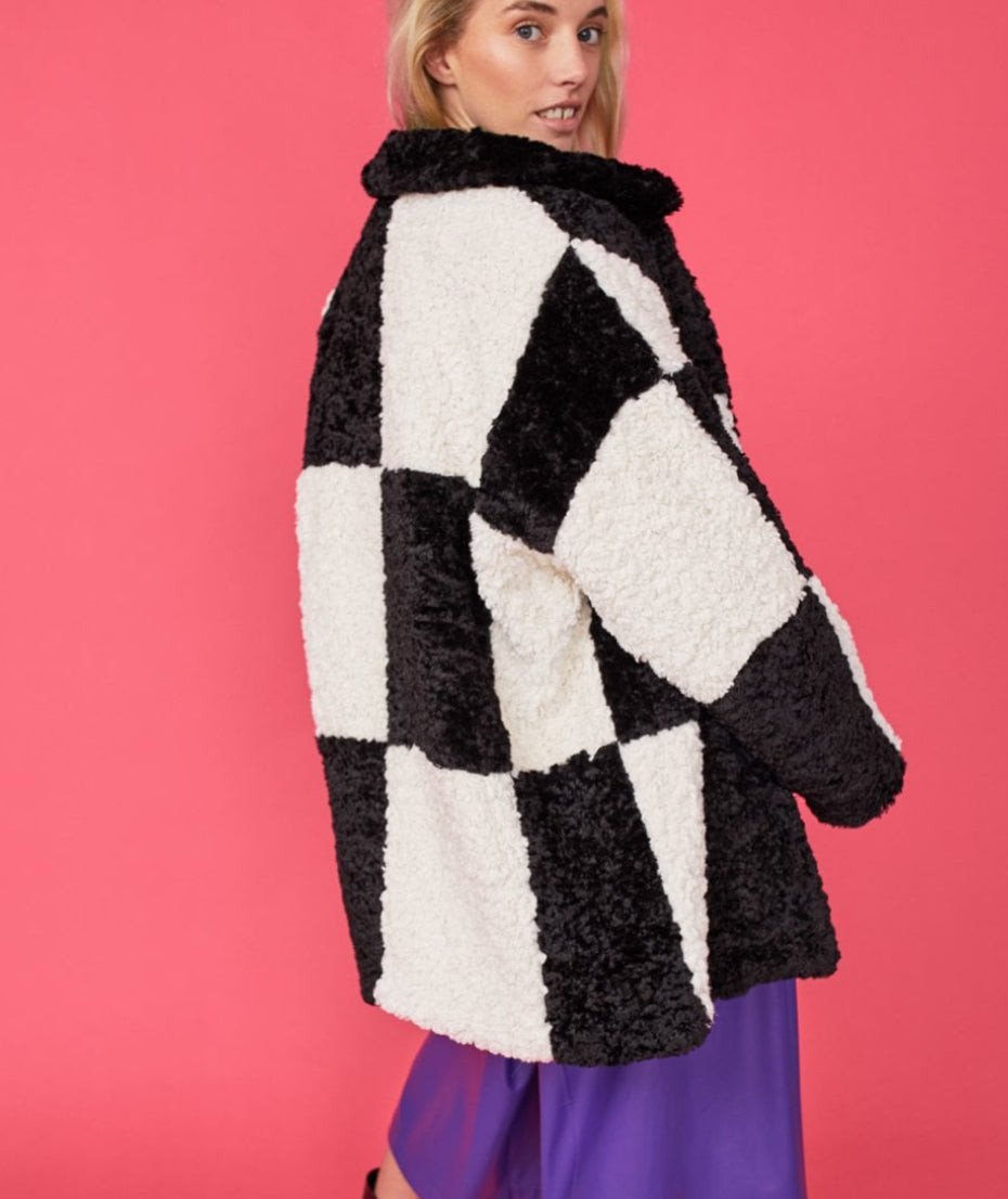 This oversized faux shearling coat is guaranteed to keep you warm and cosy whilst you look super cool. The contrasting Black and White checked pattern adds plenty of interest and the pockets and large statement buttons makes it a practical choice too.