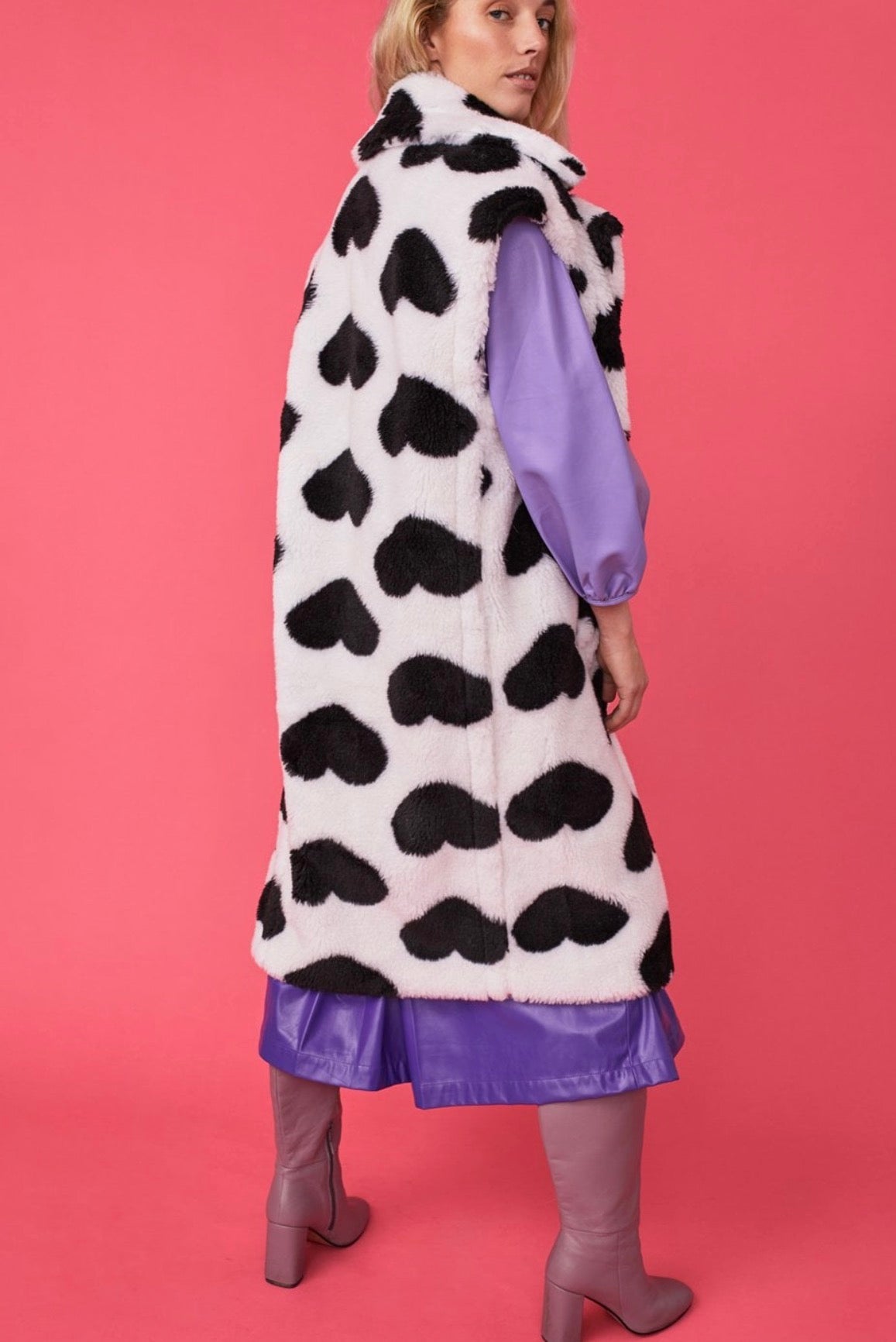 Elevate any outfit with this statement-making gilet, a beautifully bold design that's perfect for the transitional seasons - layer over a simple dress and heeled ankle boots to create that chic weekend look. Our love heart gilet is made from super-soft realistic faux fur with a contrasting black heart print all-over featuring a classic style collar, two slip pockets to the front and is lined with a animal print fabric.
