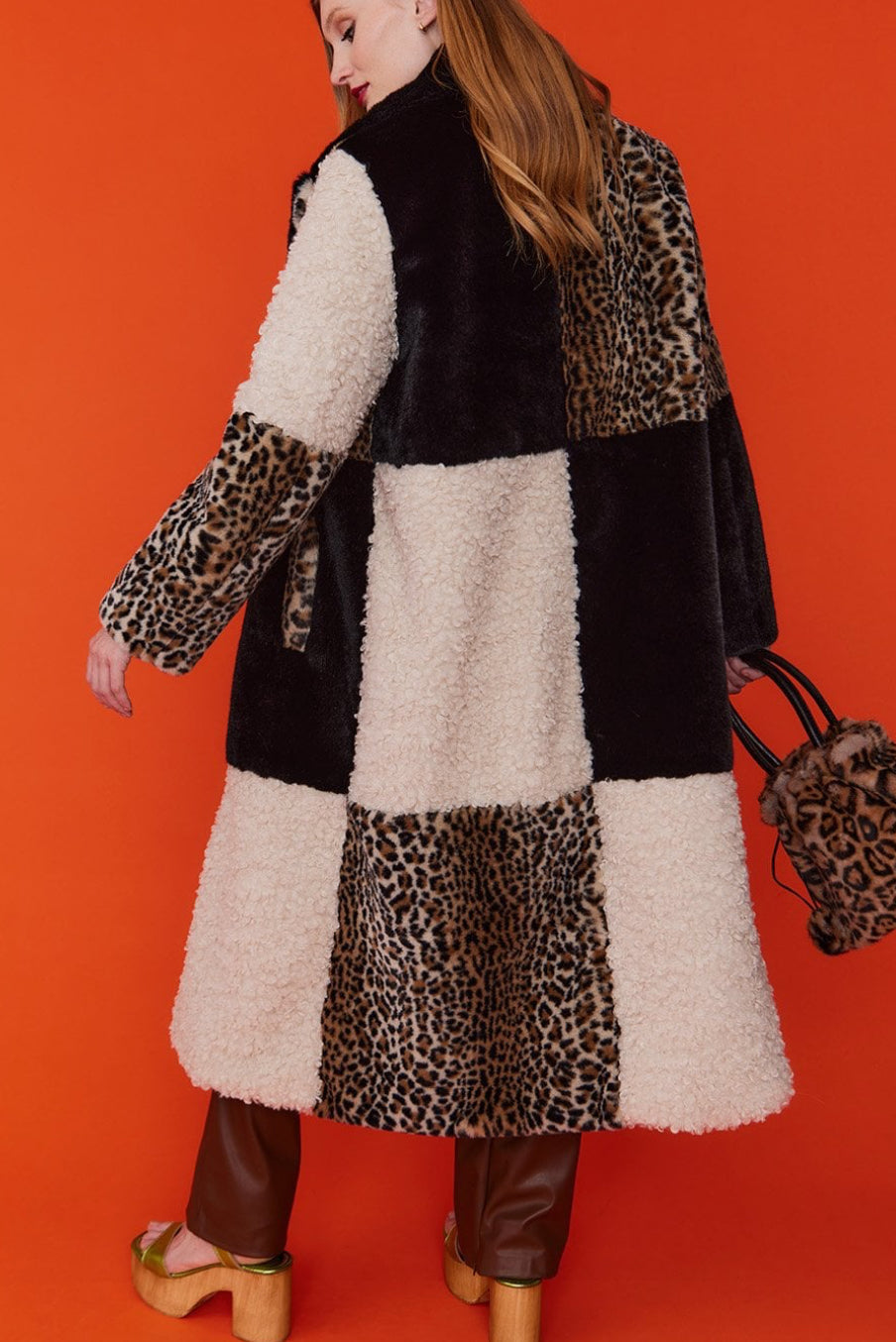 Who doesn't love animal print and when combined with a bright bold green and white shearling, it's easy to see why our latest arrival is such a big hit. This coat features an extra fluffy faux fur collar in bright blue, oversized classic lapels, pockets, leopard print and Shearling Check Design and full silk lining.