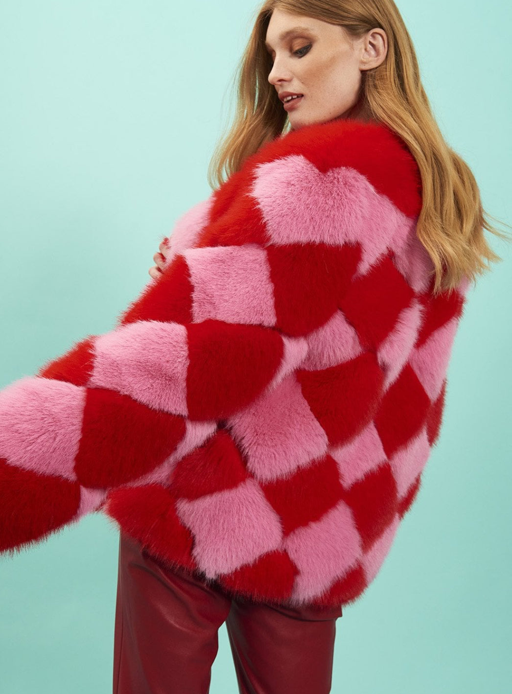 Our pink and red diamond check jacket made from the finest faux fur is a real statement piece. Beautiful and bold this sumptuously soft coat will keep you warm and in style throughout the cold winter months.
