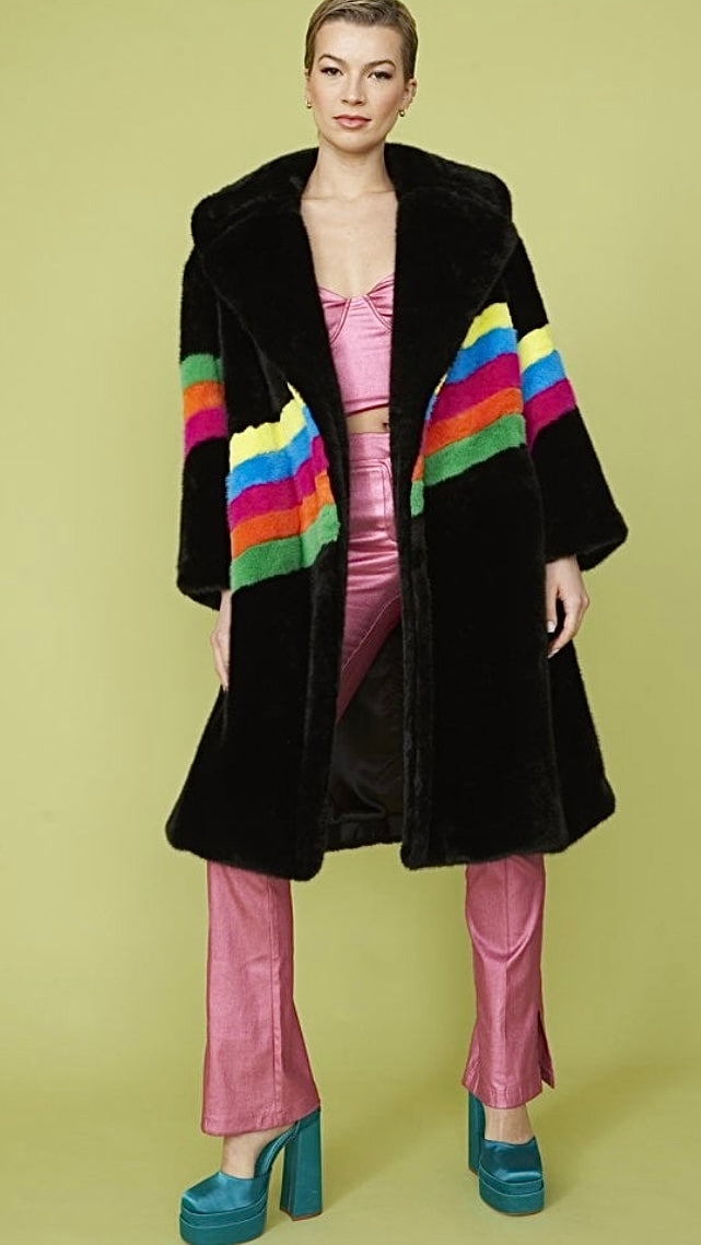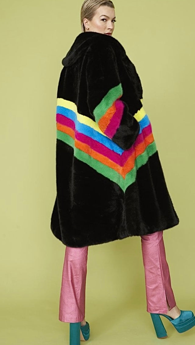 Elevate your look with this gorgeous oversized faux fur coat with rainbow detail. Featuring oversized lapels and side pockets. What is not to love?
