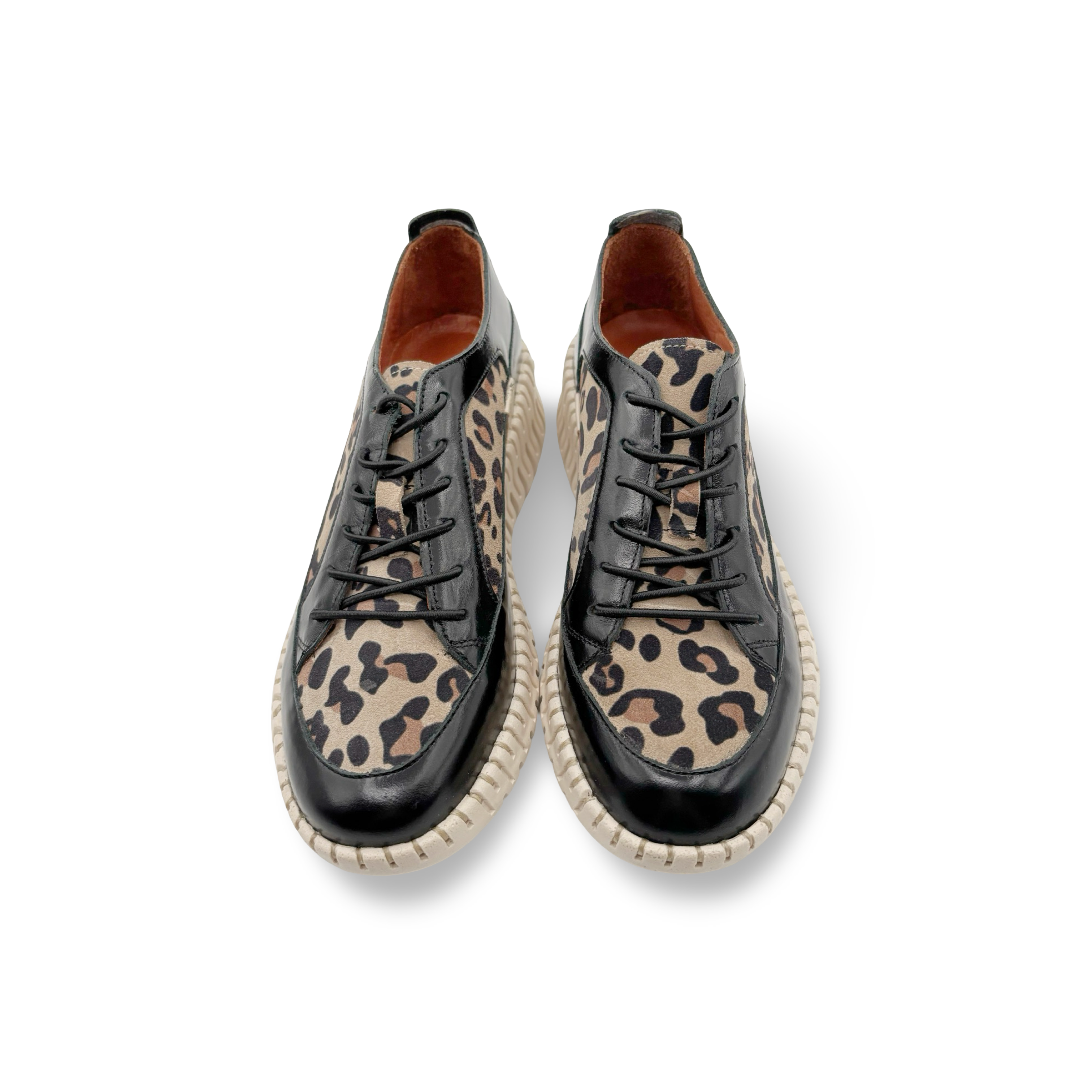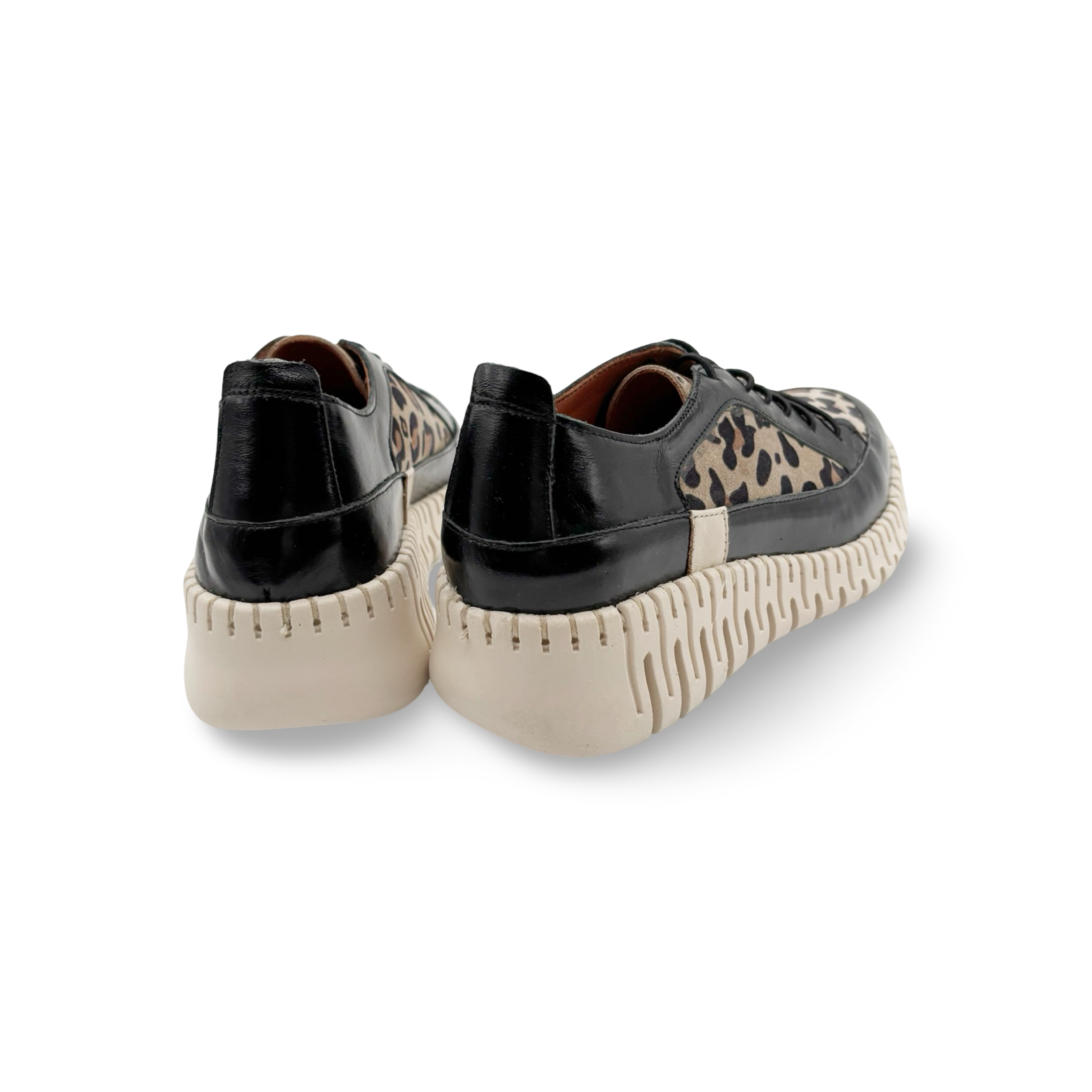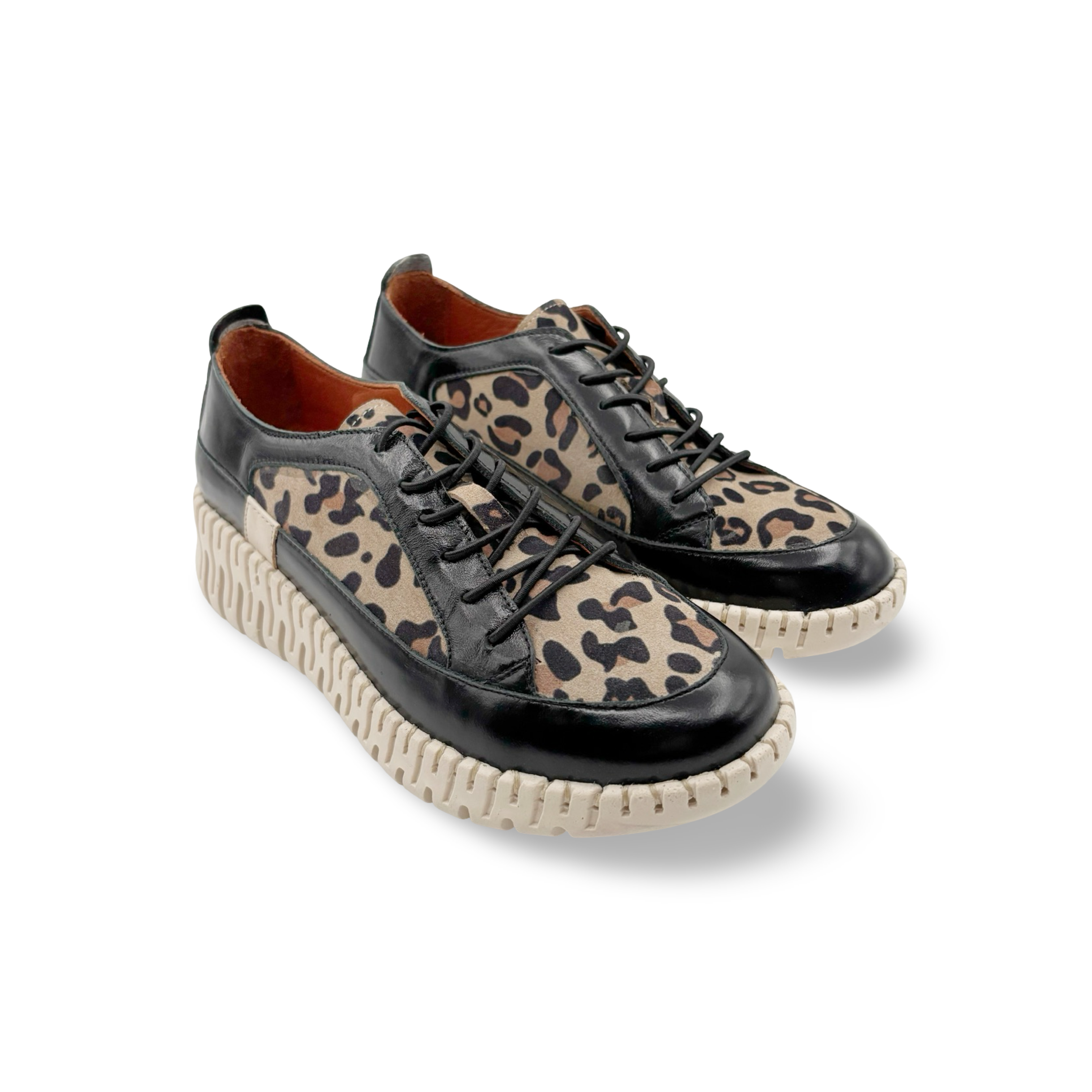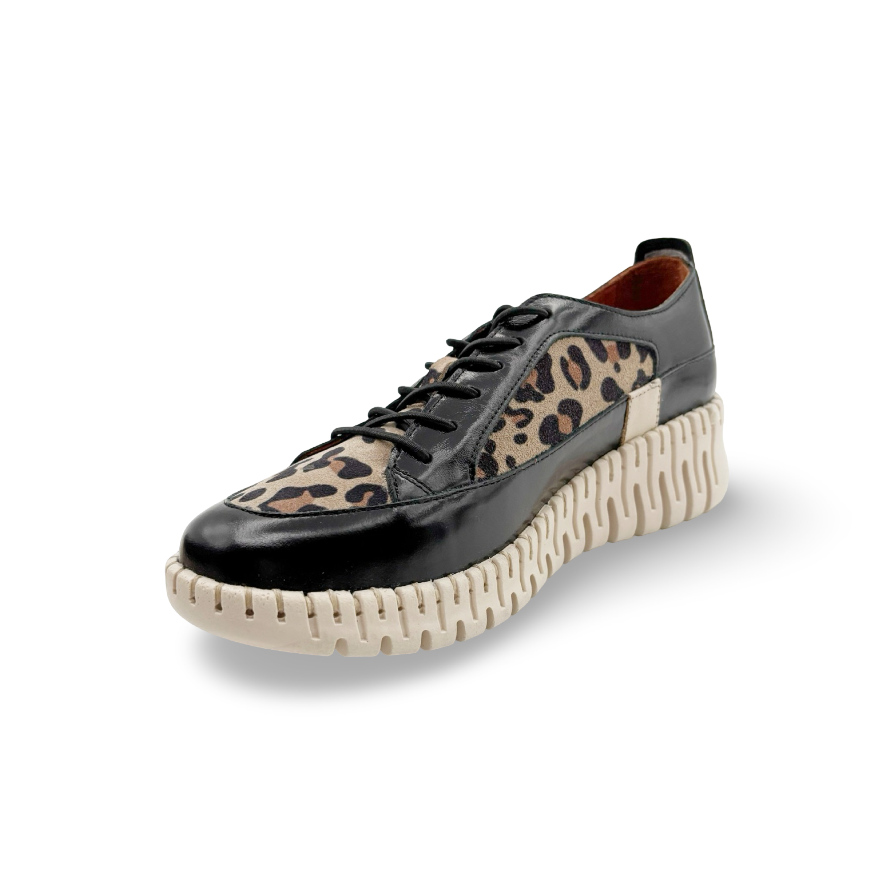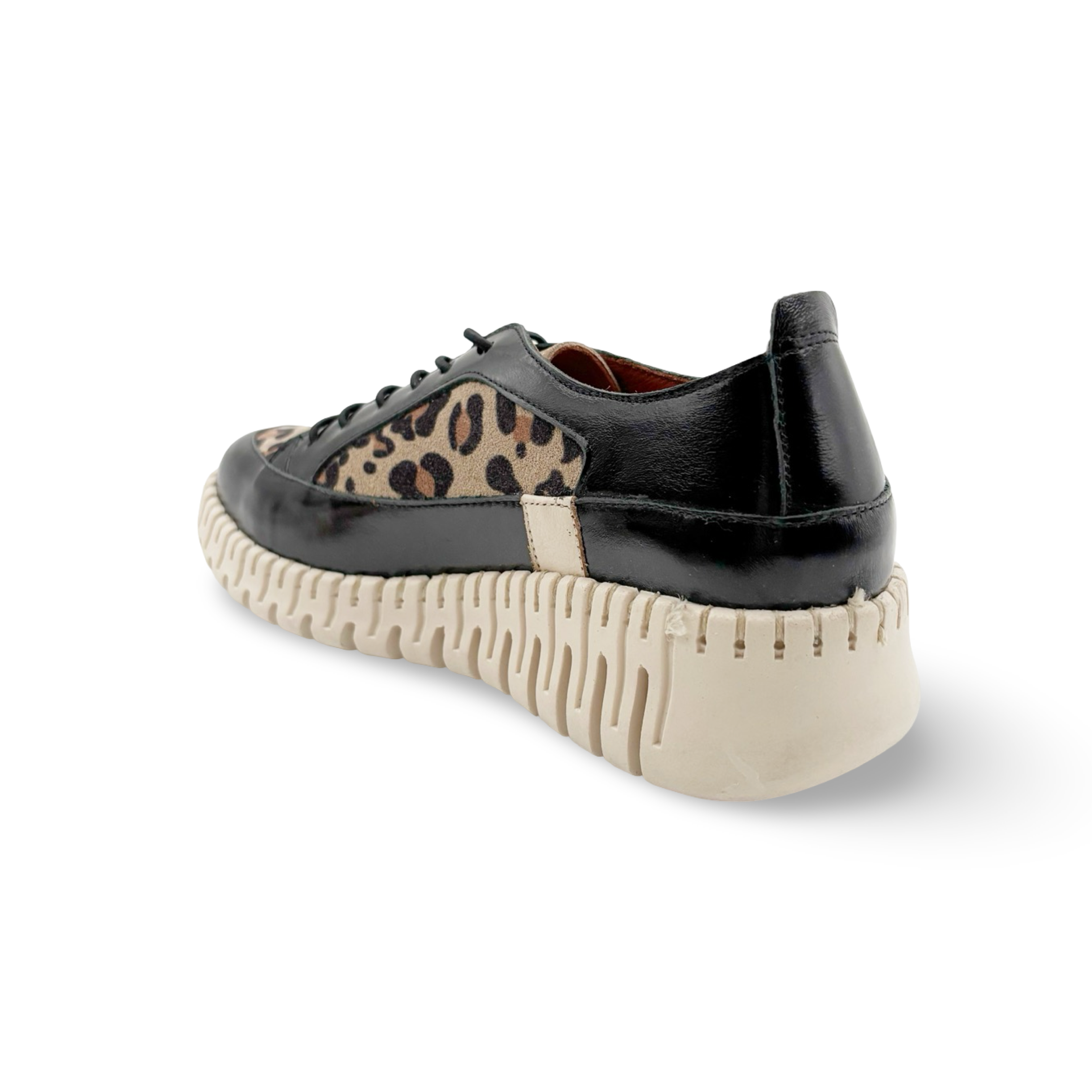 Elevate your style with our Jaya low Wedge Lace up, featuring a sleek combination of black patent and striking cheetah print. Specially designed for comfort without sacrificing style, these high top wedges are sure to make a statement wherever you go. Perfect for adding a touch of boldness to any outfit.
