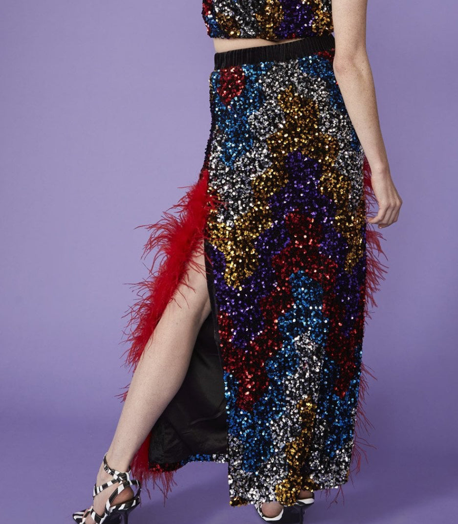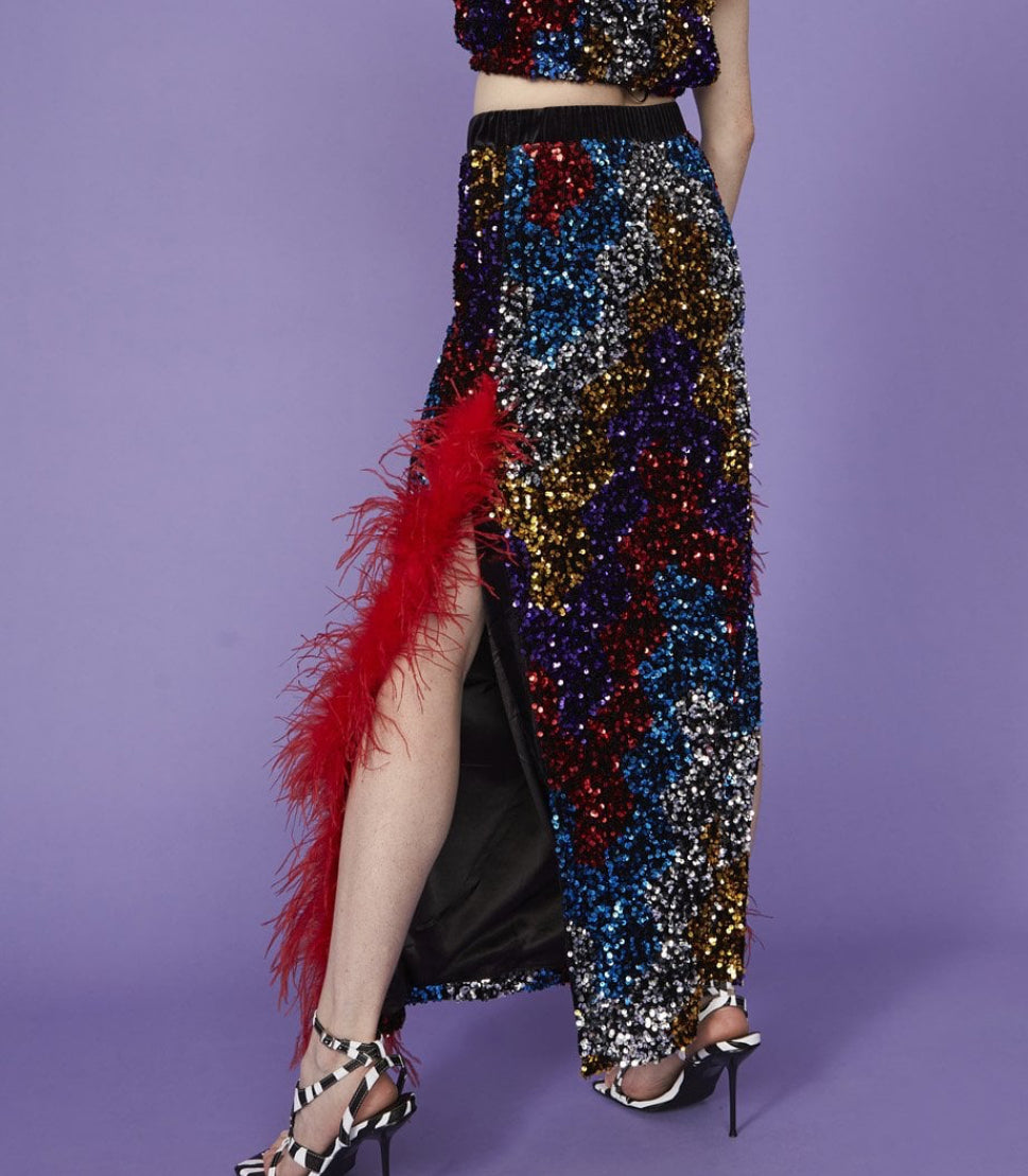 Upgrade sparkle season with this gorgeous sequin midi skirt with feather trim. This skirt is crafted from our softest velvet which is adorned with our latest multi-coloured sequins. This skirt features an elasticated waist.