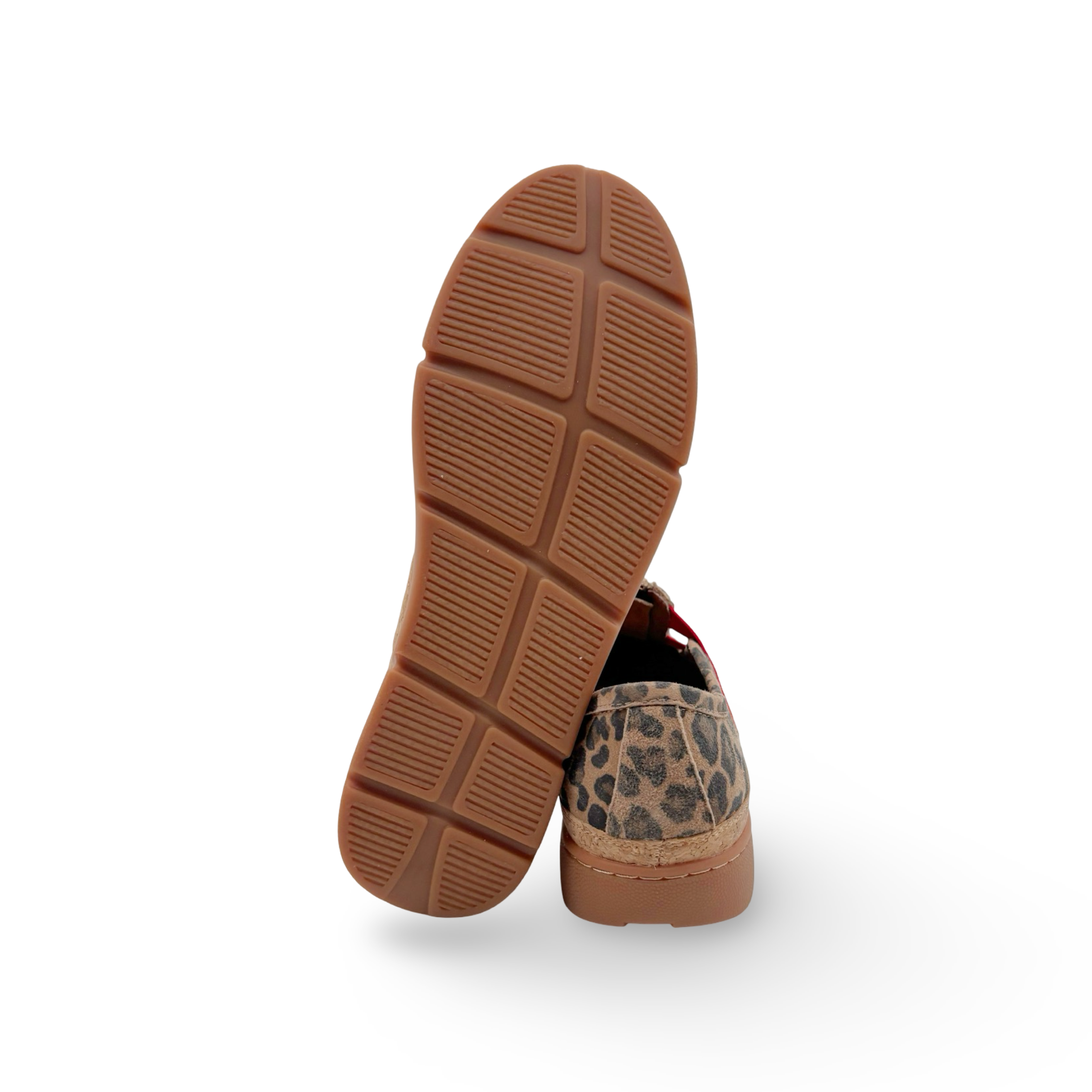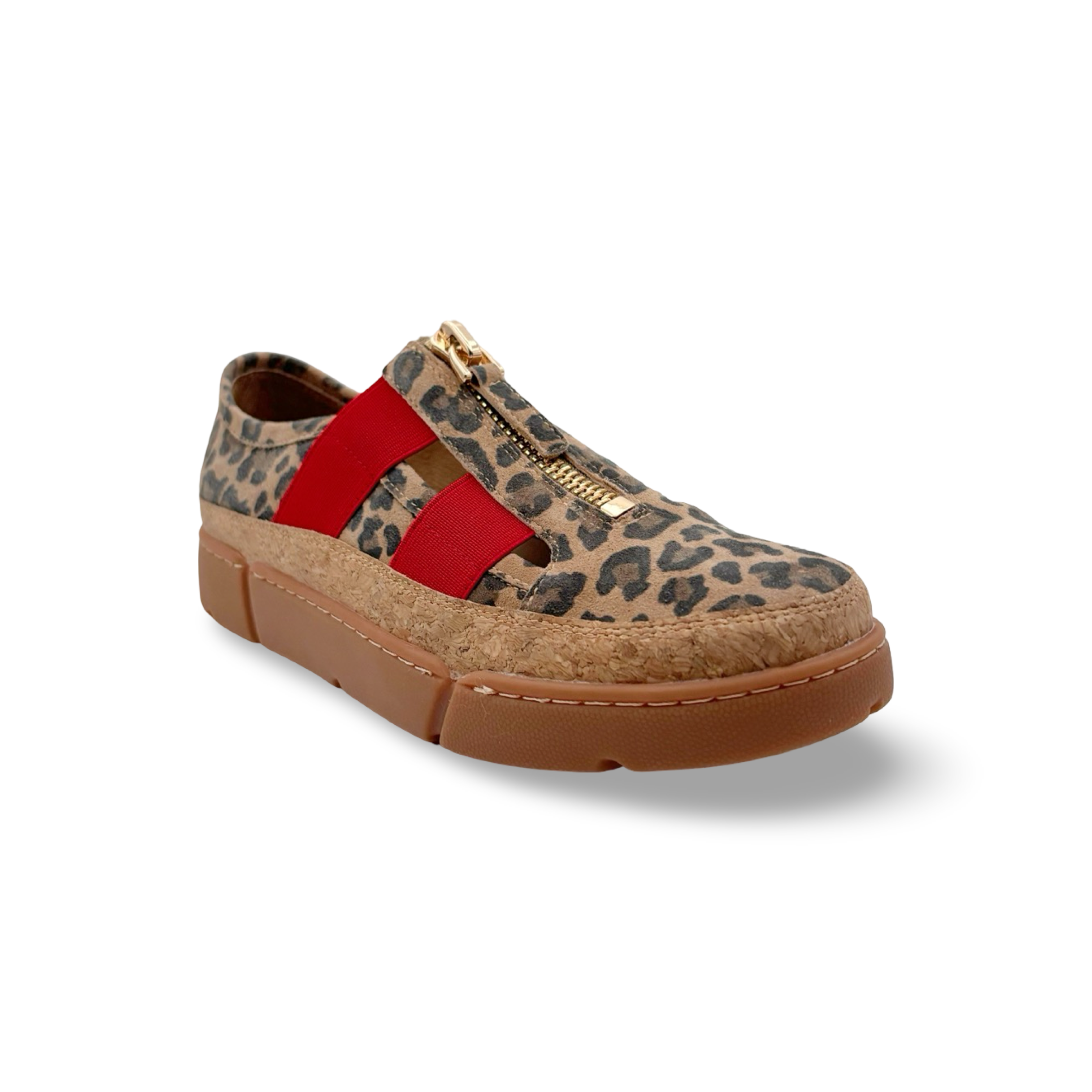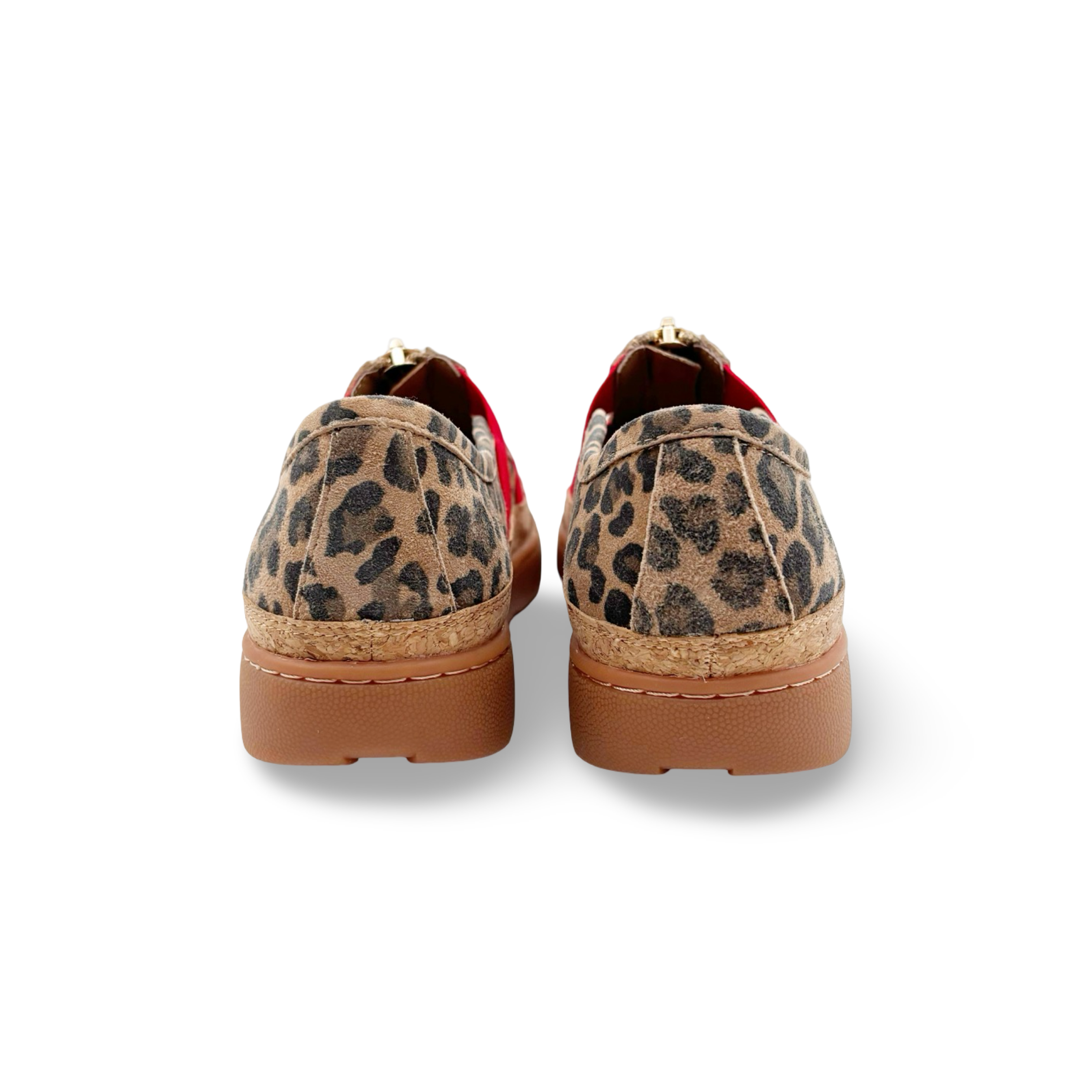 Step your casual wear up a notch with these leopard and red suede flat shoes with zipper and elastic for easy wear by Django & Juliette. Teni has a simple silhouette with a twist that is made for laidback looks from work to weekend.